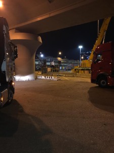 My jdeme rovně, po dvě stě metrech nás ulice zatočí sama vlevo do části kde už je vidět hodně kamionů a vstupní brána, která se zavře v 19 hodin.